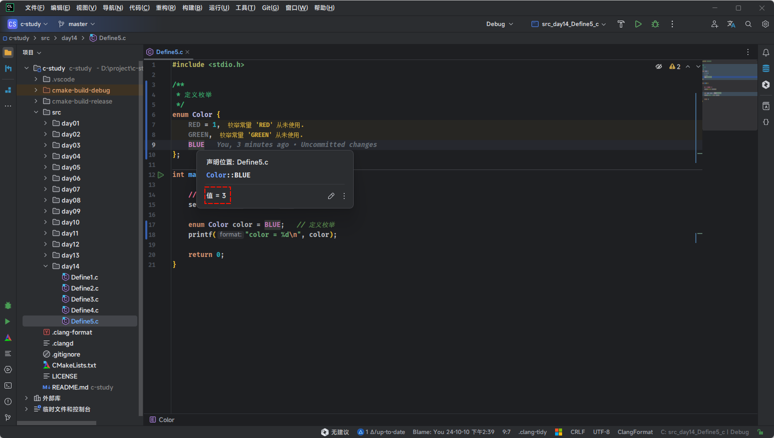CLion 中选中枚举元素并使用快捷键 Ctrl + Q,或将鼠标悬浮在枚举元素上,就会自动显示枚举元素对应的值,如下所示: