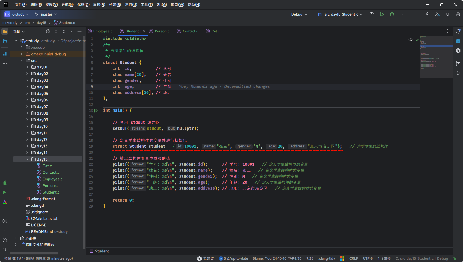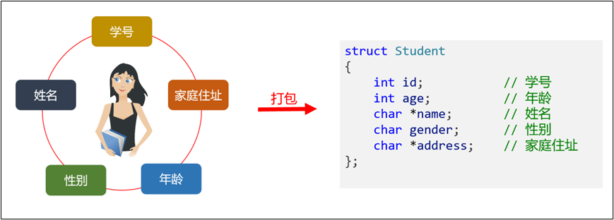 struct Student stu = {10001, "张三", 'M', 20, "北京市海淀区"};